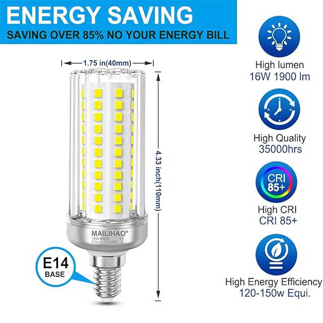 Experience the superior brightness of MAILIHAO Bright E14 LED Corn Bulbs that deliver a crisp daylight white light at 6000K and an impressive 1900 lumens output. These 16W bulbs are designed as energy-efficient replacements for 120W/150W incandescent bulbs, offering significant energy savings without compromising performance. Crafted for a smooth, flicker-free lighting experience, they are ideal for both residential and commercial spaces where consistent, eye-comfortable illumination is essential. Designed with a standard Edison screw base and packaged in a convenient pack of 5, these non-dimmable bulbs provide reliable, long-lasting performance.
